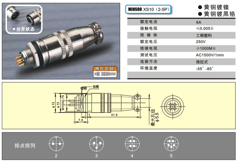 MINSOO 3芯航空插头 XS10JK-3P/Y 连接器 XS10-3P 3芯 开孔10mm
